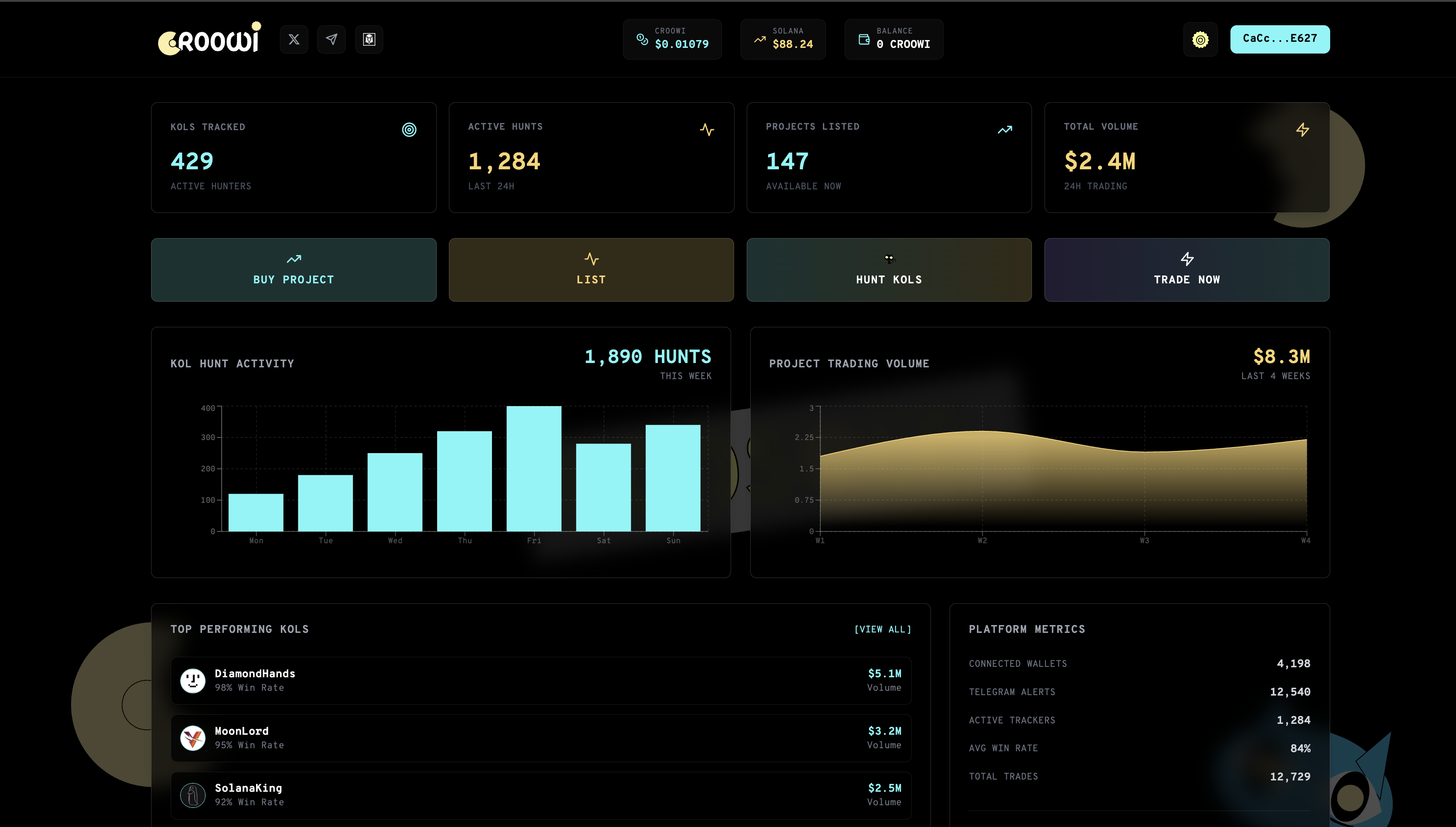 - Wallet analytics: portfolios, transaction history, trading patterns. Smart alerts for KOL trades and token movements.